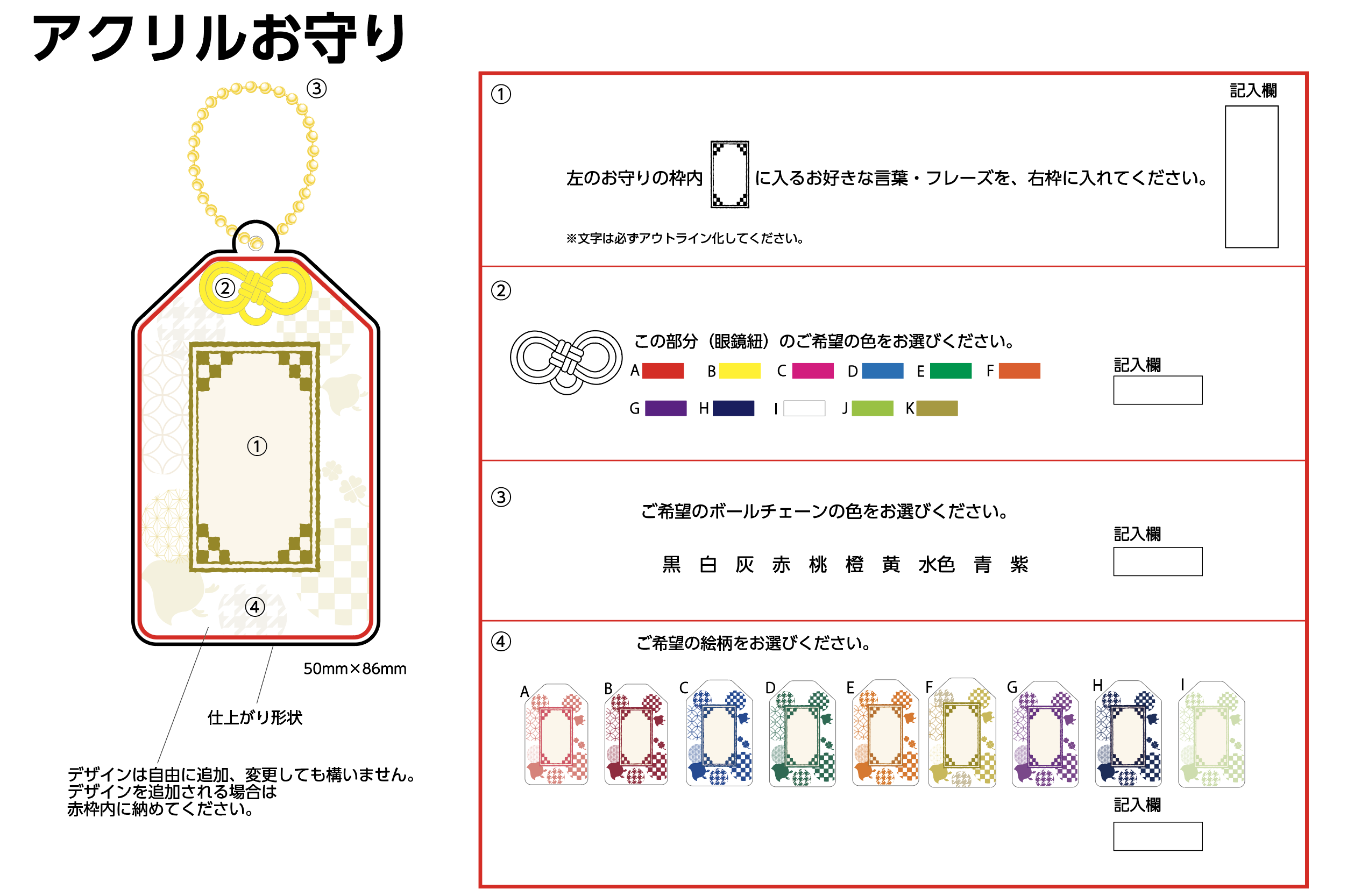 | 仕様 | アクリルお守り 1つのデザインから9つのカラーパターンをお選び頂けます。 ボールチェーンの色をお選び頂けます。